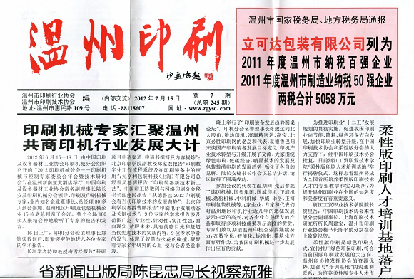 2012年6月15日至18日,由中国印刷及设备器材工业协会印刷机械分会组织召开的"2012印刷机械分会--印刷机械与控制专家委员会年会暨技术研讨会"在温州新南亚大酒店举行。 参加会议的专家代表在17日上午来到我公司参观,对公司的近几年的发展表示由衷的高兴,对企业自主研发的产品(ZX-320型PS版商标卷筒胶印机等)和取得的多项科技成果表示高度的赞赏。