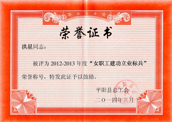 恭贺尊龙凯时人生就博官网登录办公室主任洪星同志荣获2012-2013年度女职工建功立业标兵荣誉称号